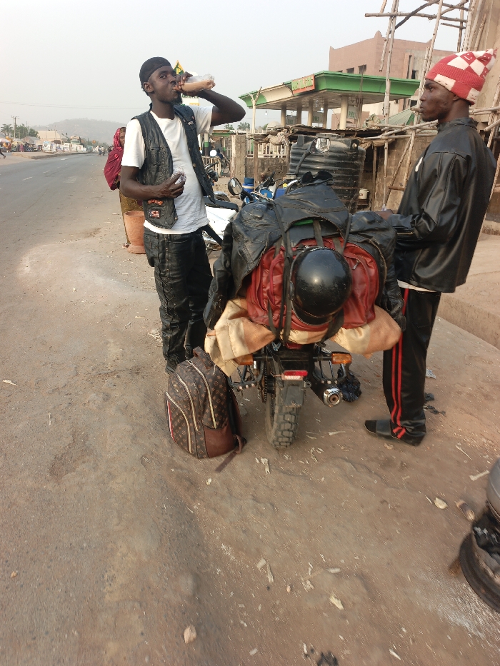 Two men stand next to a motorcycle heavily laden with baggage. One man, wearing a leather vest and cap, drinks from a bottle. The other, in a red and white hat and leather jacket, looks towards the street. A gas station can be seen in the background. A backpack sits on the ground next to the motorcycle. The scene takes place on a street with a rural building in the background.