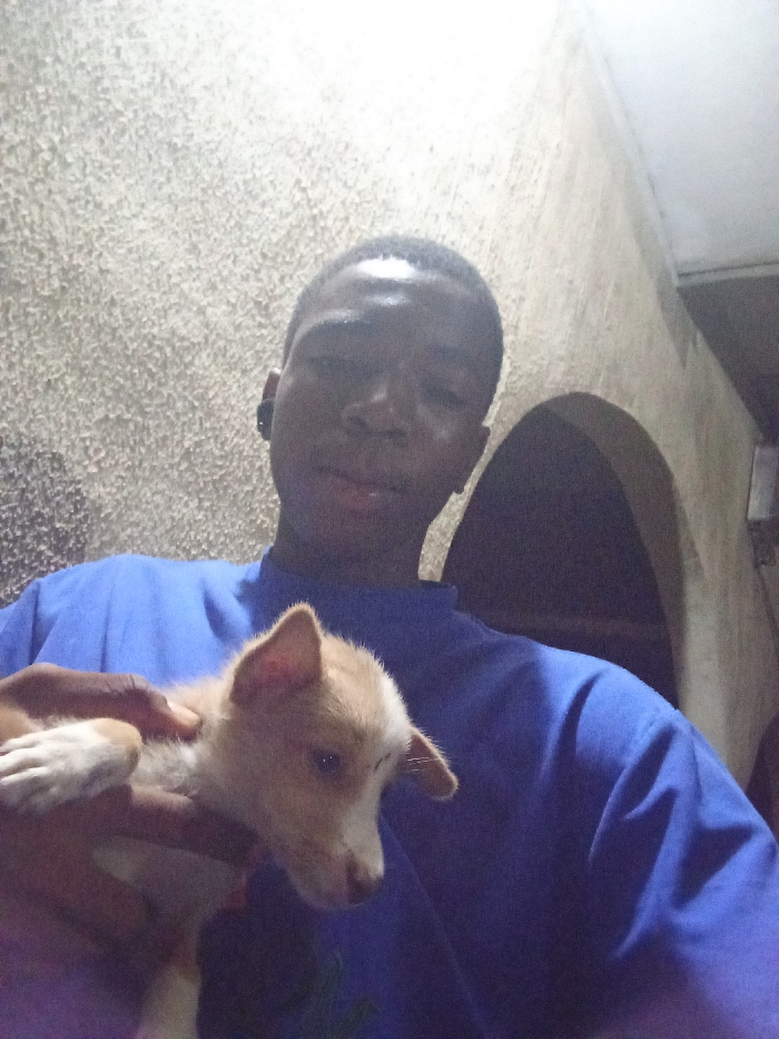 - "A young man in a blue shirt holds a light brown and white puppy" by FM-NXjx43, licensed under CC BY 4.0