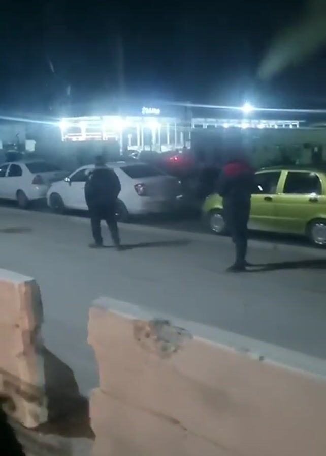 At night, a man in dark clothing walks on a street. Another man in a red shirt stands further down the road. Cars are parked on the side of the street, and a gas station is visible in the background, brightly lit. A concrete barrier runs along the bottom of the frame. The video is taken from inside a vehicle. The man in dark clothing adjusts his head covering as he walks.