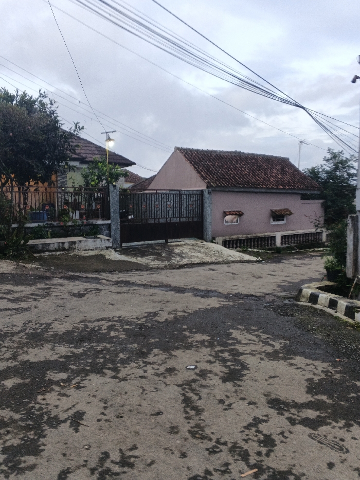 A narrow, patchy asphalt road leads to a house with a red tile roof and pink exterior. The house has two small windows with awnings. A dark metal gate and a low concrete barrier separate the house from the road. Adjacent to the house is another dwelling with a more open gate, partially obscured by greenery. Overhead, a network of power lines crisscrosses the sky. The sky is overcast and the street is damp.