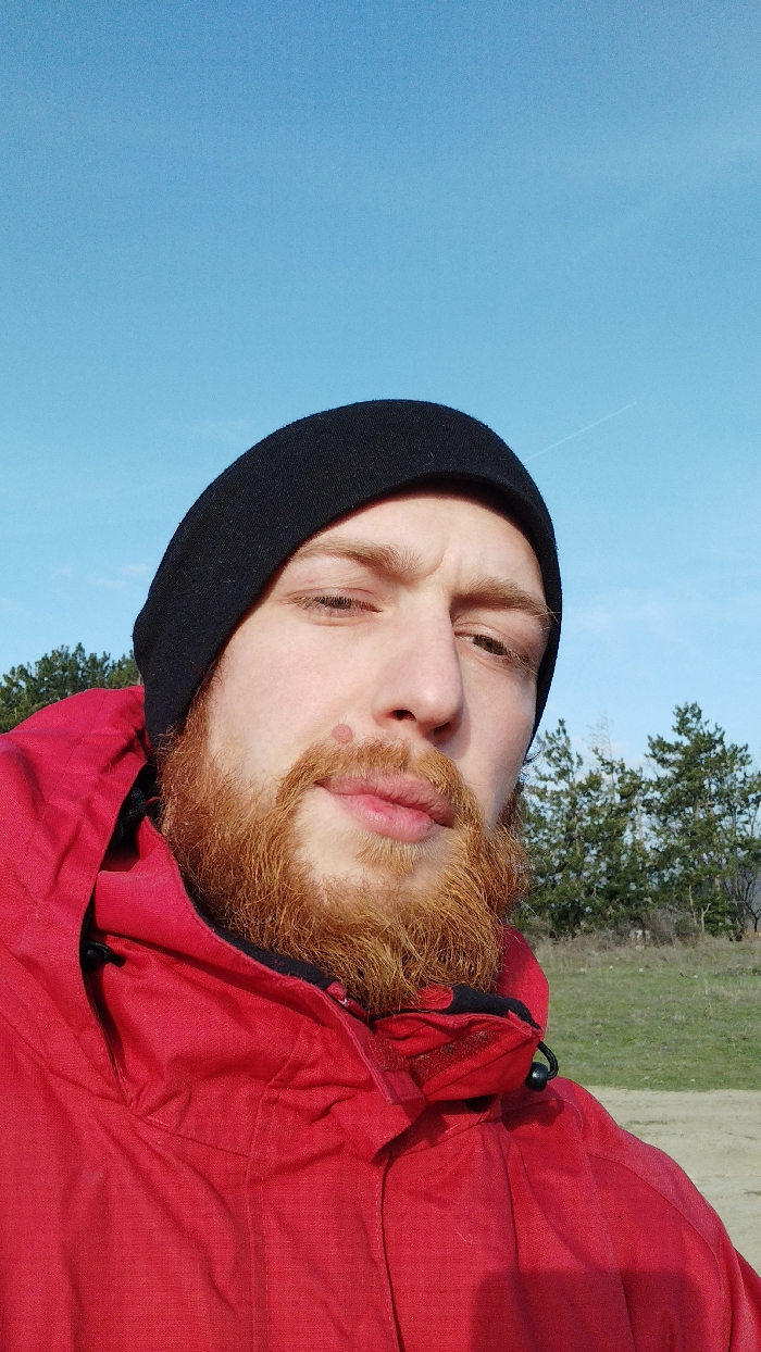 A close-up outdoor portrait features a male subject with light skin, a ginger beard, and a black beanie