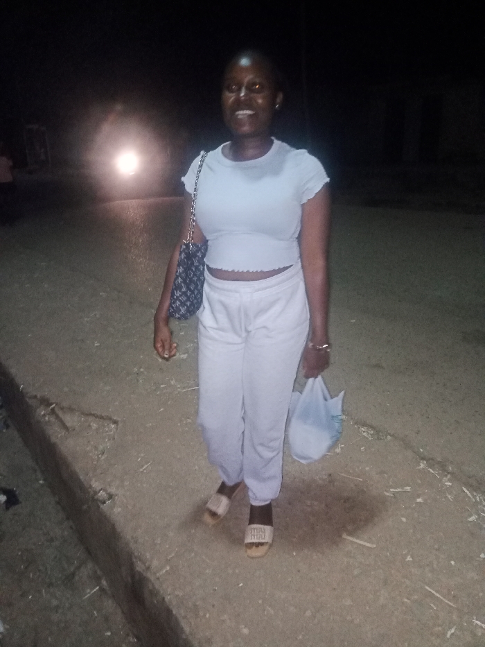 An adult female subject is depicted standing outdoors at night in Unknown, Unknown. She faces the camera directly, exhibiting a smile with visible teeth and partially squinted eyes. The subject has dark, short hair or a shaved head and is wearing a light-colored, possibly white, ruffled-hem crop top and matching light-colored sweatpants. She wears light-colored slides, with "MIU MIU" visible on the strap of the right slide. A dark, patterned shoulder bag with a chain strap is slung over her left shoulder, and she holds a white plastic bag in her right hand. A bracelet is visible on her left wrist. The ground beneath her is a light-colored, uneven surface, consistent with dirt or a worn paved area. A raised concrete curb or divider is present along the left side of the frame. In the dark background, a single bright light source, possibly a vehicle headlight, illuminates a portion of the ground behind the subject, with vague outlines of structures visible in the distance.