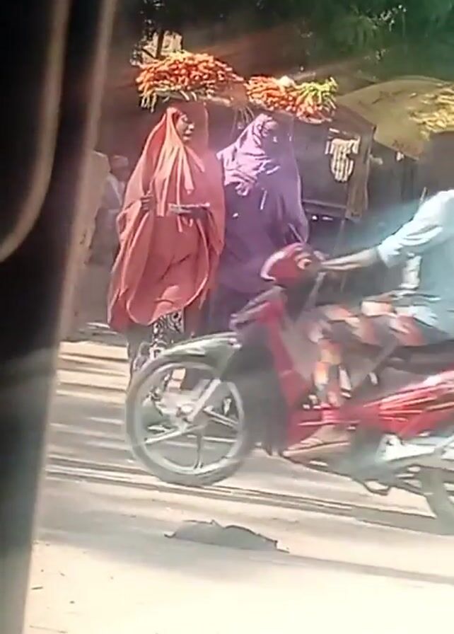 Two women wearing headscarves and carrying produce on their heads walk on a road. One woman wears a peach-colored scarf, while the other has a purple scarf. The produce appears to be a mix of carrots and possibly other vegetables. They are walking on a paved road in a sunny environment with trees and buildings in the background. A goat walks beside the women, and a motorcycle is parked nearby.