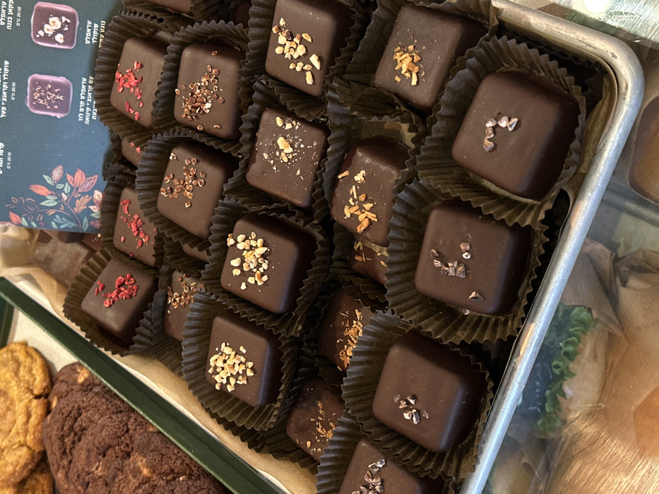 The image presents a detailed close-up of a confectionery display, likely within a retail establishment in Israel, as indicated by the prominent Hebrew text on the background sign. The specific location within Tel-Aviv is not identifiable from the visual information, but the establishment style is consistent with a patisserie or chocolate shop in a major Israeli city. The central focus is a rectangular metal tray filled with numerous square-shaped, dark chocolate candies, each contained within a dark brown fluted paper cup. These chocolates feature diverse toppings: some are adorned with finely crushed light-colored nuts, others with small red flakes (suggestive of dried raspberries), a third variety has dark brown granular particles (possibly cacao nibs), and a fourth type displays lighter, yellowish-brown flakes. The candies are arranged in an orderly grid. To the left of the chocolate tray, a portion of another food display is visible. This includes a row of round, golden-brown cookies with a textured surface, and below them, several darker brown, similarly textured cookies. A dark green, rigid divider separates these baked goods from the chocolates. In the upper right background, a dark green sign with white Hebrew lettering is visible. The sign incorporates stylized illustrations of cacao pods and leaves and displays small photographs of various chocolate types, corresponding to the actual candies in the tray, likely describing flavors or ingredients. The bottom of the image shows a blurred reflection, consistent with items being viewed through a transparent display case. No individuals are present, and no actions or interactions are depicted; the scene is a static presentation of food products.