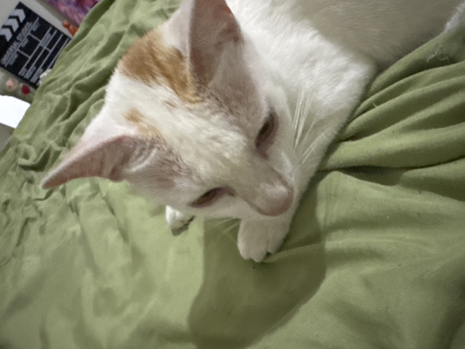 - "A domestic cat, predominantly white with orange-brown markings on its head, is depicted lying on a rumpled, olive-green fabric surface" by FM-Oi8nu1, licensed under CC BY 4.0