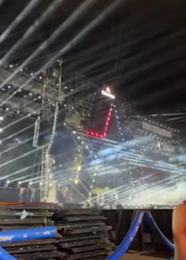 large outdoor stage setup with a complex scaffolding structure, large speakers, and a brightly lit central sign. The lighting includes white searchlights and a red zigzag shape. The stage is obscured by haze or fog. Several figures can be seen on stage, though their details are not clear. In the foreground, metal scaffolding and blue tubing are visible, suggesting the viewer is behind the scenes. A person in a red shirt is partially visible on the right. The camera pans upwards to reveal the ceiling structure over the stage, and another person can be seen holding up a cell phone to record. The sound suggests that a loud performance or concert is taking place.