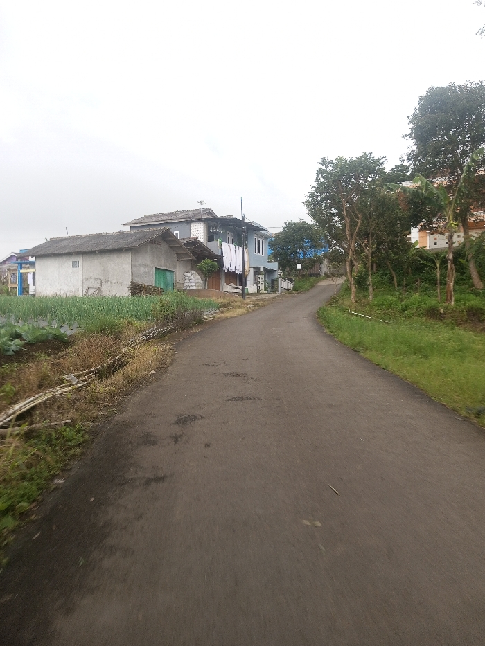 An asphalt road in Kandapola, Sri Lanka, curves slightly to the right and ascends under an overcast sky. On the left, a cultivated field of green leafy plants borders the road, behind which stands a single-story, light grey building with an attached smaller structure featuring a green door and stacked sacks. Adjacent to this, a two-story house with a light blue lower facade and grey upper section displays white laundry hanging from a balcony. A dark utility pole stands near this residence. Further left, partially obscured structures are visible. The right side of the road features a grassy embankment populated with various trees and shrubs, some with visible trunks, others with dense green foliage. In the upper right background, a multi-story, light-colored house with a reddish roof is discernible amongst trees on elevated terrain. No individuals or active interactions are present in the scene.