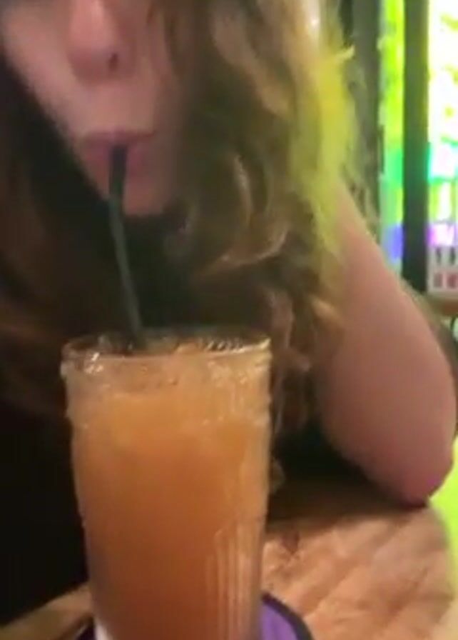 A woman with long curly hair, wearing a camouflage headband, is sitting at a table and drinking from a tall glass with a straw. The glass appears to contain an orange-colored liquid. The table is made of wood and has a purple coaster. The background suggests an outdoor seating area of a bar or restaurant, with colorful lights visible in the background. The woman is looking at the camera while she drinks.
