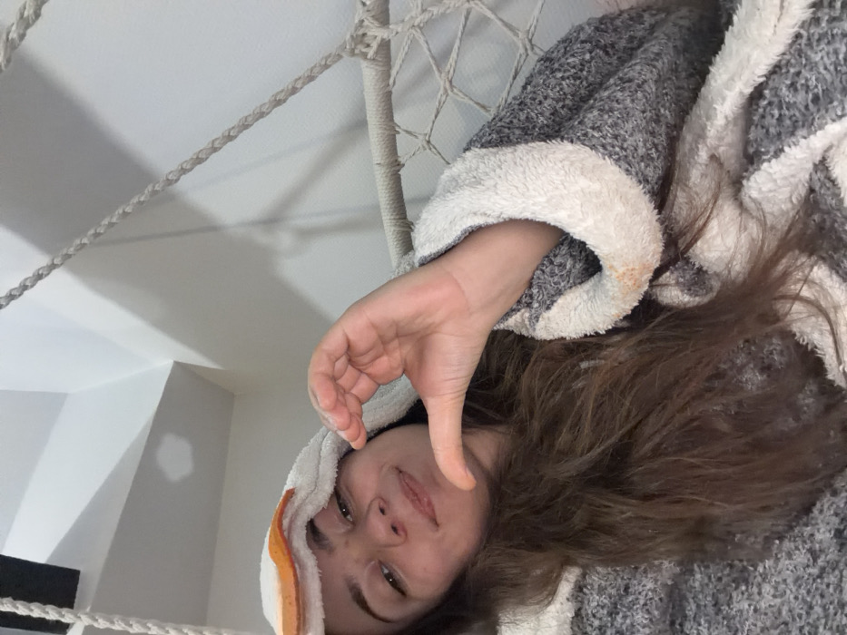 A person, with brown hair and a grey and white robe, is photographed from a low angle against a white ceiling. They are facing the camera, with a slight smile. Their right hand is held up, fingers curved to form half a heart shape. A rope net is visible in the upper left, suggesting the person is in a hammock or similar hanging seat.