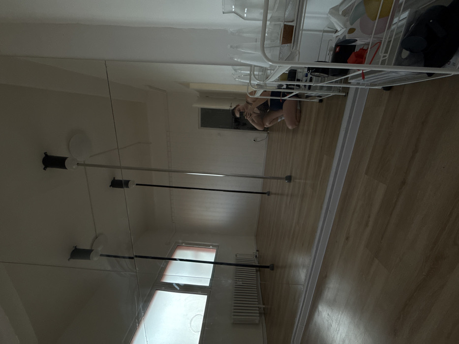 The image displays an indoor studio space in Bratislava, Slovakia, viewed through a large, wall-mounted mirror. The reflected room features white walls, a light brown wooden laminate floor, and two windows on the left with translucent coverings, beneath which a white radiator is installed. Three vertical poles, two dark and one metallic, are visible, extending from the floor to the ceiling. A doorway leading to another room is present in the background on the right. In the foreground, partially obscured by a white, multi-tiered metal shelving unit holding various bottles and objects, a single individual is reflected. This individual, dressed in a dark sports top and dark shorts, is positioned in a low crouch, holding a smartphone, and appears to be taking a photograph of their reflection in the mirror.