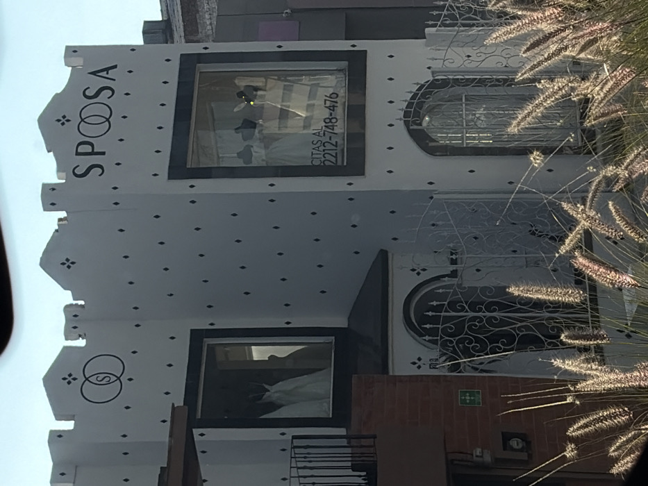 A building facade with a bridal theme is visible. The word "SPOSA" is displayed vertically on the upper left. Two windows show wedding dresses. The upper window has text "CITAS AL 2212-748-476". The building's white facade is patterned with small black diamond shapes. Decorative metalwork surrounds arched windows. The building has a crenellated roofline. Plants partially obscure the view on the right side.