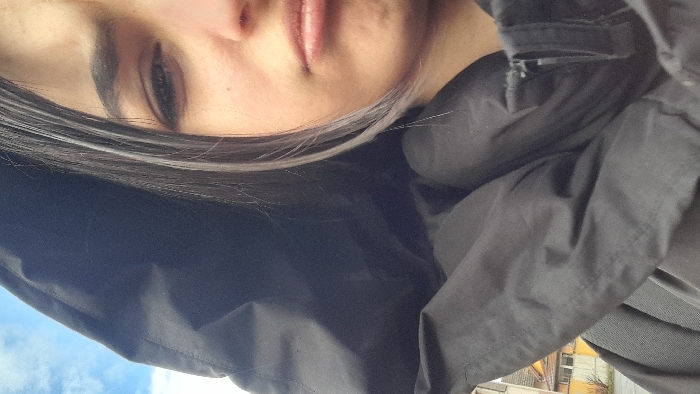 An outdoor portrait photograph captures the right side of a young female subject, positioned at a high angle. The setting is stated to be Meistratzheim, France. The subject is wearing a dark-colored, hooded jacket, with the hood pulled up and covering the upper left portion of the image. Her dark hair, featuring prominent silver-grey streaks, frames her visible cheek. Her right eye is partially visible, beneath a thick, dark eyebrow. Her lips are closed and downturned, forming a pouting expression. A zipper detail is visible on the right front of the jacket. The background is blurred, revealing residential buildings: a light-colored structure with a visible window opening, and a yellow-façade building with white window frames and bare tree branches nearby. Above the jacket's hood, a segment of blue sky with scattered white clouds is visible.