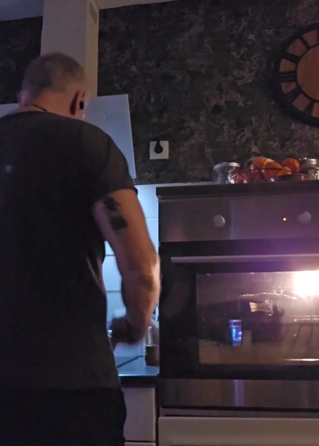 A man stands in a kitchen facing an oven. The man has a gray beard and is wearing a dark t-shirt and dark pants. He has a tattoo on his right arm. The oven is stainless steel and is lit from within. Behind the oven, there is a countertop with various objects on it. On the wall behind the countertop, there is a clock and a patterned wall covering. The man appears to be preparing or checking food in the oven. The lighting in the kitchen is somewhat dim. Music plays in the background.
