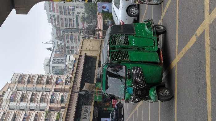 - "A green auto rickshaw parks on an asphalt road marked with yellow lines" by FM-9iqtw2, licensed under CC BY 4.0