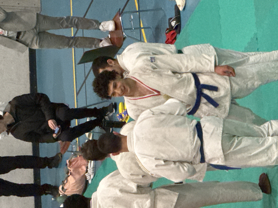 The scene depicts an indoor sports facility in Brumath, France, characterized by a light blue floor with yellow demarcation lines, transitioning to a green padded mat area in the foreground and mid-ground. A light gray wall serves as the background. At least seven individuals are visible. In the central foreground, a young male with dark, curly hair wears a white judogi with a blue belt and a gold medal on a red and white striped ribbon around his neck; he is smiling broadly and looking towards the left. He appears to be interacting with another male judoka, whose back is to the viewer, also wearing a white judogi with a blue belt. A third judoka in a white judogi is partially visible to the right of the smiling male, facing left. To the far left, another judoka in white is partially visible, wearing a brown slip-on shoe on his left foot. In the mid-ground, on the left, a male in a dark puffer jacket, dark pants, and dark athletic shoes is seated on a dark metal chair with a light brown seat, holding a small light blue object in his hands. Near his feet on the blue floor are a dark water bottle, a pink duffle bag, and white sandals with dark stripes. To the right, another male in a light gray suit jacket, light gray pants, and white sneakers stands atop an identical dark metal chair. Red clothing and black sandals (Umbro brand) are on the blue floor near the base of this chair. In the upper left background, the lower half of an individual wearing dark pants and shoes is visible.
