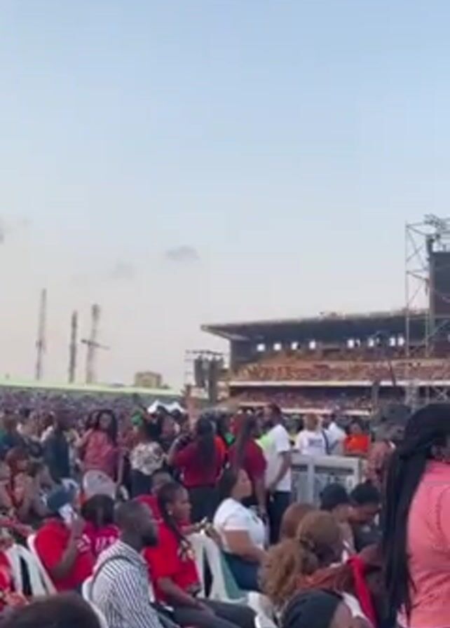 large crowd of people seated at an outdoor event, likely a concert or festival. The crowd is densely packed, with many individuals dressed in a variety of colors and styles. Some people are holding up their phones, seemingly to record the performance or take pictures. In the background, a large stage setup is visible, complete with screens and lighting rigs. The sky is a light blue with some scattered clouds, indicating it might be late afternoon or early evening. A stadium or large structure filled with people is visible beyond the stage. The atmosphere appears lively and engaged, with the crowd focused on the event unfolding on the stage.