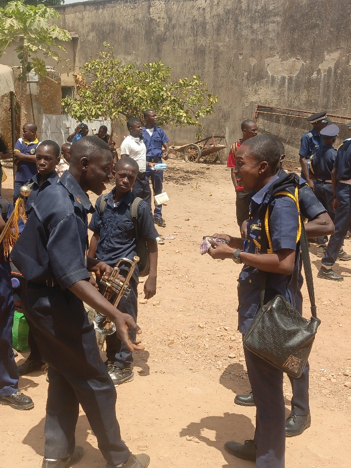The image captures an outdoor gathering of approximately a dozen males, predominantly young adults and teenagers, on a reddish-brown dirt ground, consistent with a city environment in Ube, Nigeria. The scene is illuminated by bright daylight, casting visible shadows. In the immediate foreground, two young males in dark blue uniforms face each other in apparent conversation. The individual on the left wears a short-sleeved uniform shirt and dark trousers, holding a brass trumpet-like instrument in his left hand. His mouth is open, suggesting speech or singing. The individual on the right wears a similar dark blue short-sleeved uniform with yellow trim and a black shoulder bag embossed with a pattern resembling the Gucci logo. He holds a folded piece of multi-colored fabric or paper in his hands, his mouth also open and directed towards the other individual. Behind the left foreground figure, a younger male in a dark blue button-up shirt with a backpack looks towards the camera. Additional individuals, many in similar dark blue uniforms, are scattered in the mid-ground. One male in a white t-shirt and another in a red and black striped shirt are also visible. Some individuals on the far left carry parts of other musical instruments. The background consists of a tall, weathered concrete or stone wall, appearing stained and aged, which extends horizontally across the frame. A small deciduous tree with green foliage stands in front of the wall on the left. To the right of the tree, a wooden cart or handcart with spoked wheels is visible near the wall. The ground throughout the scene is bare earth, with some small debris scattered. The overall impression is an organized or social gathering in a public or semi-public outdoor space.