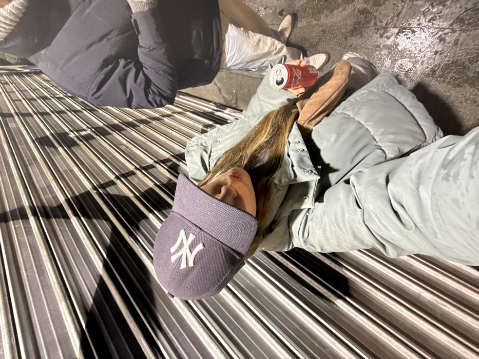 From an overhead angle, a person wearing a gray New York Yankees baseball cap and a light green puffy jacket lies on a corrugated metal surface. Next to them, a second person in a dark gray jacket sits. A red Coca-Cola can rests near the first person's head. Tan shoes are partially visible in the background. The scene appears to be at night or in dim lighting.