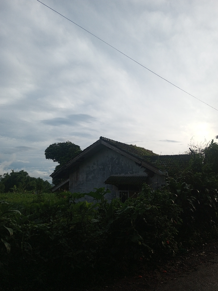 A weathered house stands amidst dense greenery under a cloudy sky. The house's gray facade is partially obscured by lush foliage. The roof is covered with vegetation. A single wire stretches diagonally across the sky. The overall scene is somewhat dim, suggesting twilight or an overcast day, with light sources to the upper right of the image.