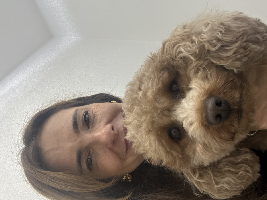 A close-up selfie captures an adult female and a small dog within an indistinct indoor setting