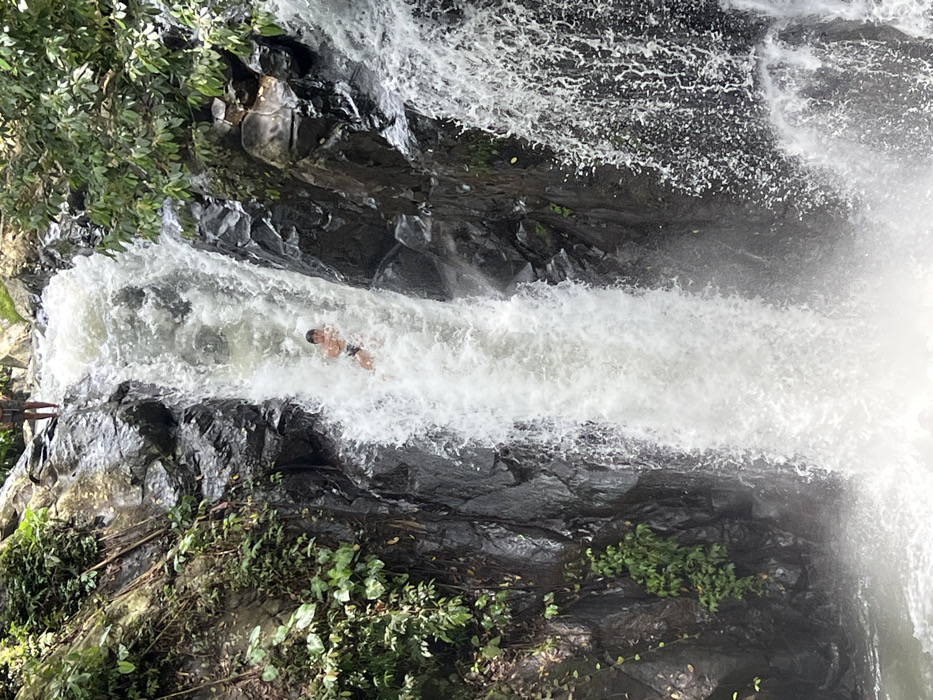 A natural waterfall scene in Ambengan, Indonesia, depicts a recreational activity. A young male, clad in dark swimming shorts, is observed sliding head-first on his back down a central channel of turbulent white water. His arms are bent, and his head is partially submerged but visible above the water. The lower legs and feet of a second individual are visible at the top edge of the waterfall, standing on dark rock. The waterfall is contained within steep, dark rock formations covered by dense green foliage, including trees and vines. Water cascades forcefully, creating significant spray and foam at its base.