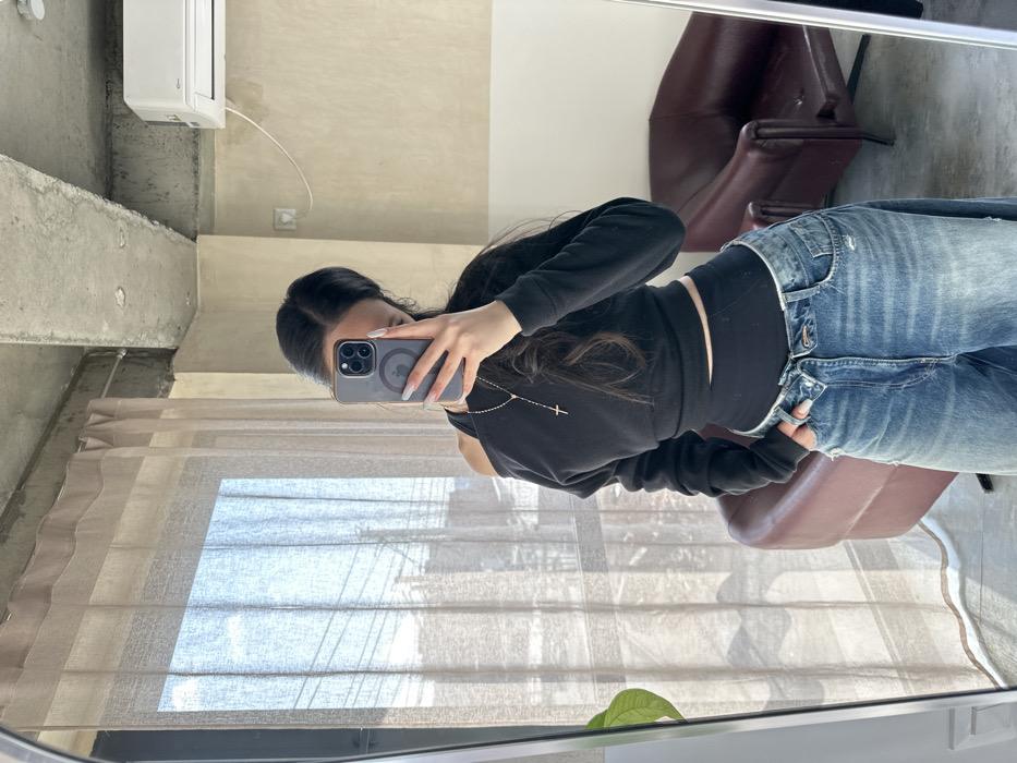The image displays a female subject taking a mirror selfie indoors in Zovuni, Armenia. The subject is wearing a black, off-the-shoulder cropped long-sleeved top over a visible black high-waisted undergarment, paired with loose-fitting, light blue denim jeans featuring a deconstructed waistband. A gold-colored rosary-style necklace with a cross pendant is present around her neck. Her left hand, adorned with a silver-colored ring on the middle finger, holds a dark-cased smartphone with a circular magnetic accessory, obscuring her face. The background, visible through the mirror, includes a large window with sheer, light-colored curtains, revealing an outdoor scene with utility lines and distant buildings beneath a bright sky. The interior walls are painted a light beige. The ceiling above is textured raw concrete with visible lighting fixtures and a white wall-mounted split-system air conditioning unit on the upper right. To the right of the subject's reflection, a dark brown leather armchair is visible. A green plant leaf is partially reflected on the far left edge of the mirror.
