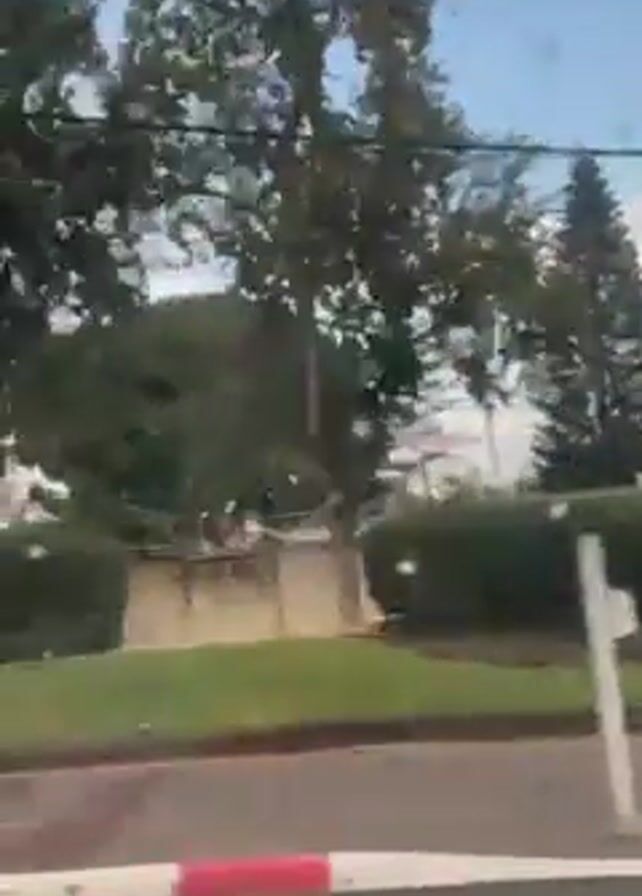 view from inside a car stopped at a red traffic light. The camera faces the outside, displaying a street with trees, houses, and a billboard featuring a young girl. The car's dashboard is visible at the bottom of the frame. Raindrops are visible on the car's windows. As the light turns green, the car accelerates.
