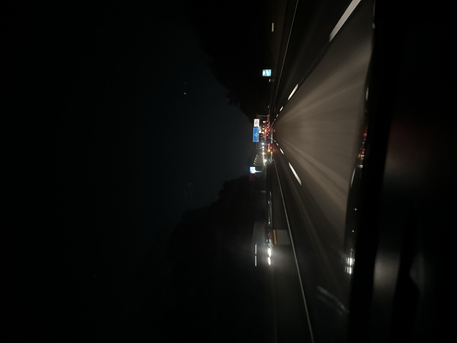A nighttime highway scene is captured from a moving vehicle. Streaks of light from oncoming headlights and taillights illuminate the road ahead. The left side reveals dark scenery. Signposts with blue and white signage are visible along the highway. The car's interior and reflection create a blurred effect on the right. The perspective is slightly tilted, emphasizing the motion and the darkness surrounding the highway.