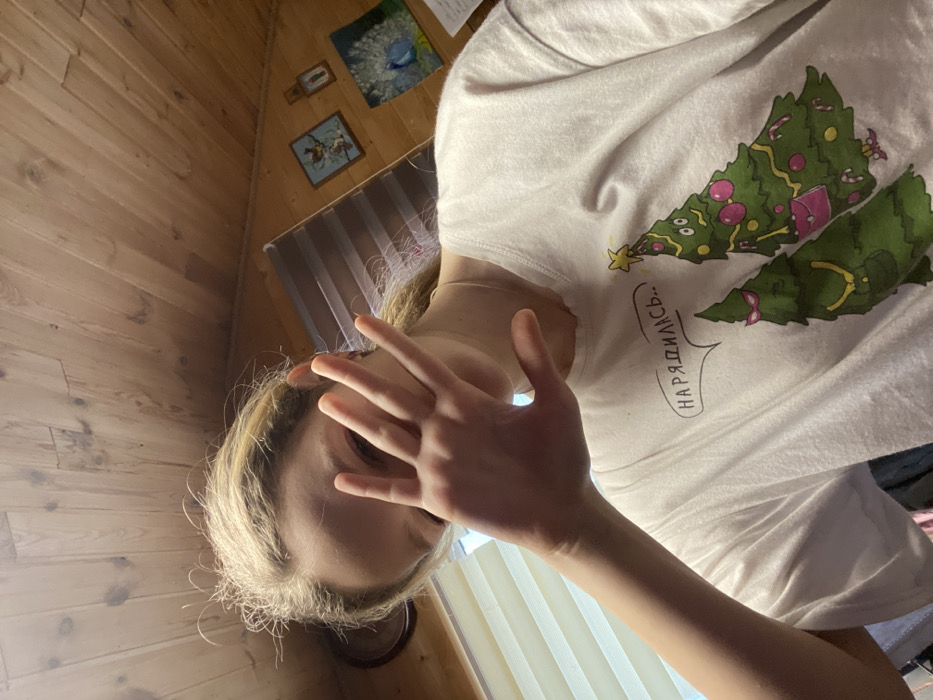 An indoor photograph shows a person from the chest up, situated in a room with a sloped wooden panel ceiling and upper walls, identified as being in Прикамский, Russia. The individual, appearing female, has light-colored hair pulled back with some wispy strands visible. She wears a white, short-sleeved t-shirt featuring a graphic of two cartoon Christmas trees. The tree on the left has pink sunglasses and a gold-colored chain, while the tree on the right is decorated with pink and yellow ornaments, candy canes, and a yellow star, also carrying a pink purse. A speech bubble above the left tree contains the Russian text "НАРЯДИЛИСЬ..". The person's left hand is raised, palm facing the camera, with the thumb, index, and pinky fingers extended, and the middle and ring fingers bent, partially obscuring the face. The right eye and a thin necklace around the neck are visible. The background includes a window with light-colored horizontal blinds on the upper left. On the right-side wooden wall paneling, two small framed pictures are mounted: the upper depicting two birds, and the lower illustrating a white peacock. A small vertical rectangular object is positioned between these frames. A portion of a round object is visible on the far left wall.