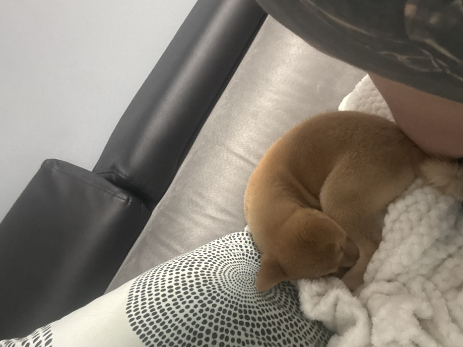 - "The scene depicts a light-colored, tan-furred canine, likely a Shiba Inu, curled tightly and sleeping on a white, textured blanket" by FM-IJRNr1, licensed under CC BY 4.0