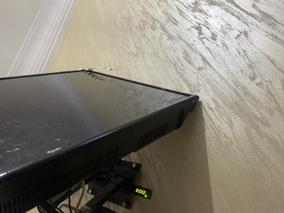 A black Condor brand flat-screen television is depicted from a low, angled perspective, showcasing its bottom edge and reflective, dust-smudged screen. A blue and white striped ribbon cable or adhesive strip is partially detached and hangs from the upper left side of the television's bezel. The television is secured by a black, articulated metal wall mount, visible behind its left side, with associated cables. A small, rectangular electronic device with a green digital display showing "8000" is attached to or resting near the bottom of the TV mount. The background is a light-colored wall or surface exhibiting a textured, coarse brush-stroke pattern, primarily beige or light tan. Shadows from the television and its mount are cast upon this textured surface. No individuals are present in the scene. This scene is located in الغنادة, Tunisia.