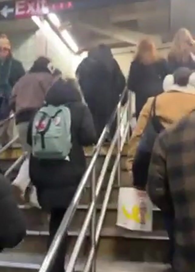 view from below as people walk up a metal staircase at a New York City subway station. Several people are visible, dressed in winter clothing like jackets and coats. The person recording the video is also moving upwards, following behind a group of individuals. A sign indicating "Exit" and "Times Sq-42 St & 7 Av" is visible at the top of the stairs. Several people carry bags and a McDonald's box.
