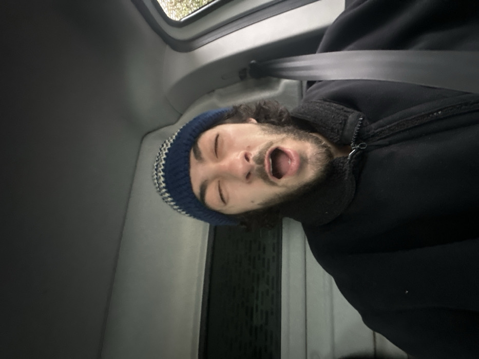 The image depicts a young adult male inside a vehicle, likely the passenger seat, though the specific location in Wasquehal, France cannot be confirmed from the visual information provided. The male has light skin, dark, wavy hair, and a dark beard and mustache. He is wearing a blue and white knit beanie and a black zippered jacket with a dark, possibly fleece, collar. His eyes are closed, and his mouth is wide open in a yawn, indicating fatigue or boredom. A black seatbelt is visible across his right shoulder and chest. The vehicle's interior features light grey or white paneling on the roof and upper sides. A darkened window is visible to the left of the subject, and through the window on the right, blurred green foliage is discernible, suggesting an outdoor setting.