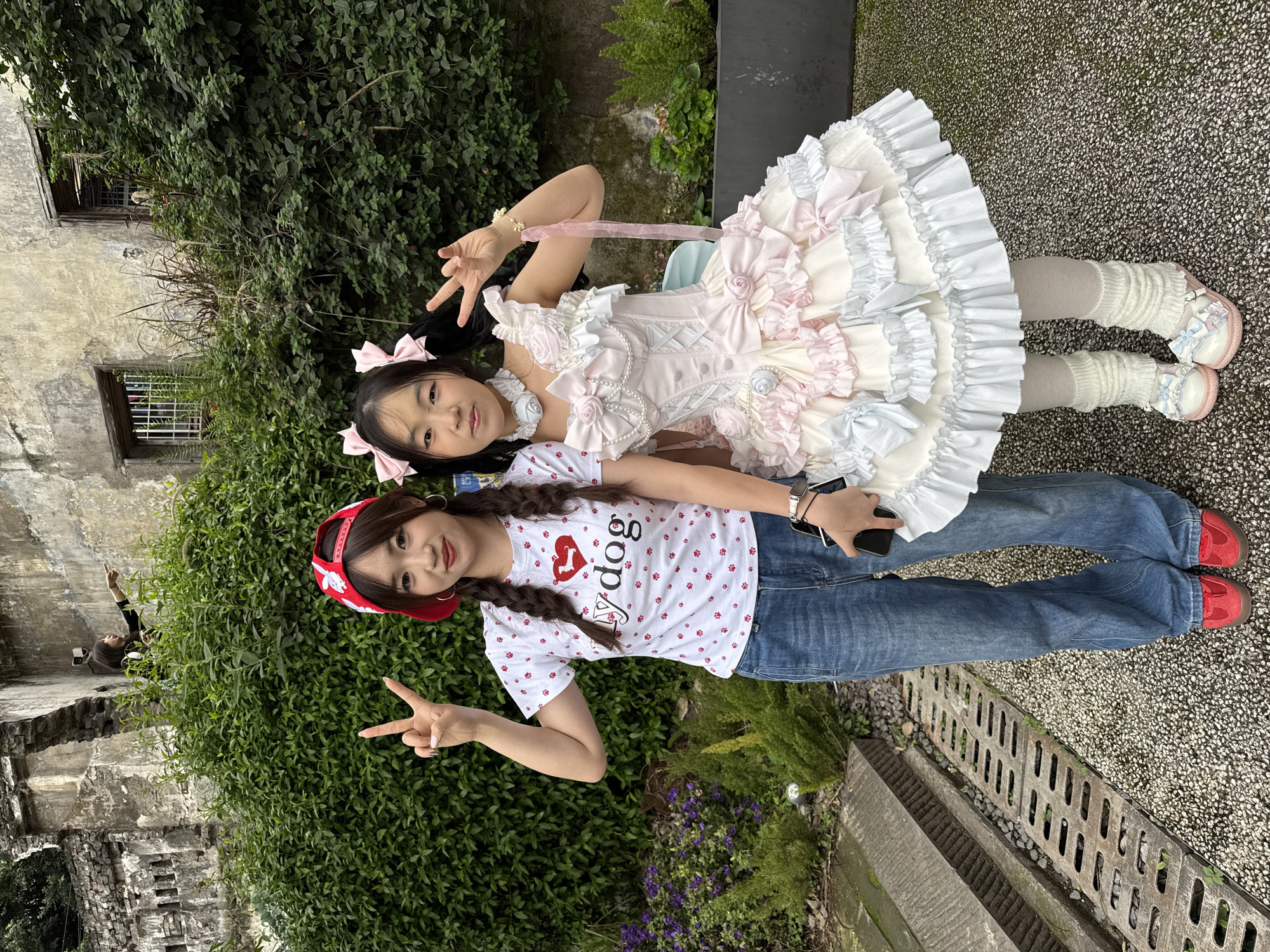 Two young women pose for a photograph in an outdoor setting within Yuzhong District, China, positioned on a pebbled concrete surface adjacent to a grated drainage channel. The woman on the left, of East Asian descent, stands with a slight smile, facing the camera directly. She wears a red baseball cap with a white design, a white short-sleeved t-shirt with red paw prints and a red heart containing "My dog," blue denim jeans, and red suede shoes with brown soles. Her dark hair is styled in two braids, and she wears hoop earrings. Her right arm is raised, hand displaying a peace sign, while her left hand holds a black smartphone. The woman on the right, also of East Asian descent, stands to the immediate right of the first woman, also smiling and facing the camera directly. She is dressed in an elaborate white and pink Lolita-style dress featuring a corset-like bodice with lacing, multiple ruffles, bows, and faux pearls. She wears a white choker with a pink rose detail, a delicate gold bracelet on her right wrist, and white knitted leg warmers over white tights, paired with pink and white Mary Jane-style shoes adorned with light blue bows. Her dark hair is styled in two pigtails, each tied with a large pink bow. Her right arm is raised, hand displaying a peace sign, and a pink fabric strap hangs from her left hand. Behind the subjects, a dense green hedge separates them from an aged stone or concrete building wall. This wall, appearing weathered and partially crumbling in sections, features two recessed wooden window frames with metal bars. Patches of lighter green foliage and purple flowers are visible near the base of the hedge and in concrete planters. A third individual, seen from the waist up, stands on a higher ledge or platform on the building wall in the upper left background, pointing to the right. The ground in the foreground is a light gray pebbled surface, with a metallic grate for drainage running parallel to the left side of the frame.