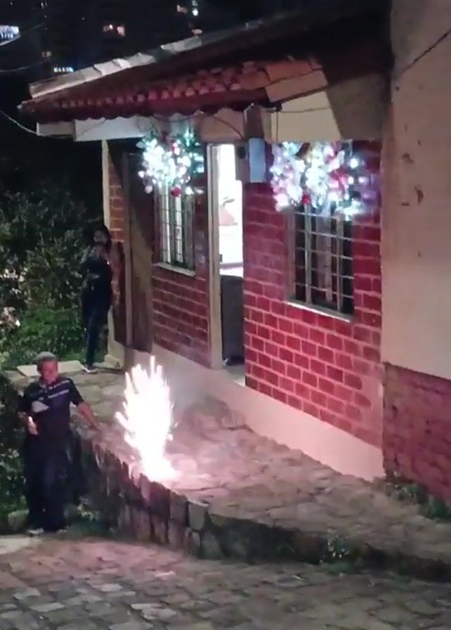 person standing next to a low brick wall in front of a small brick house with lighted Christmas wreaths in the windows, lighting off a ground display firework which sends a cloud of sparks high into the air. The house is one of several lighted buildings visible at night. A person stands in the doorway of the house. Another person is standing among some bushes nearby. The person setting off the firework is wearing a dark shirt and pants. The house has a red roof with a narrow awning. The area in front of the house is paved with bricks.