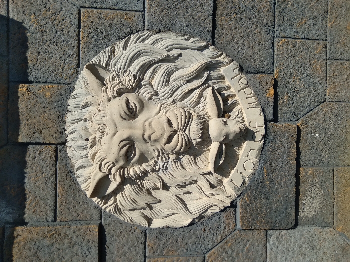 A light-colored circular relief sculpture is prominently displayed against a textured stone wall