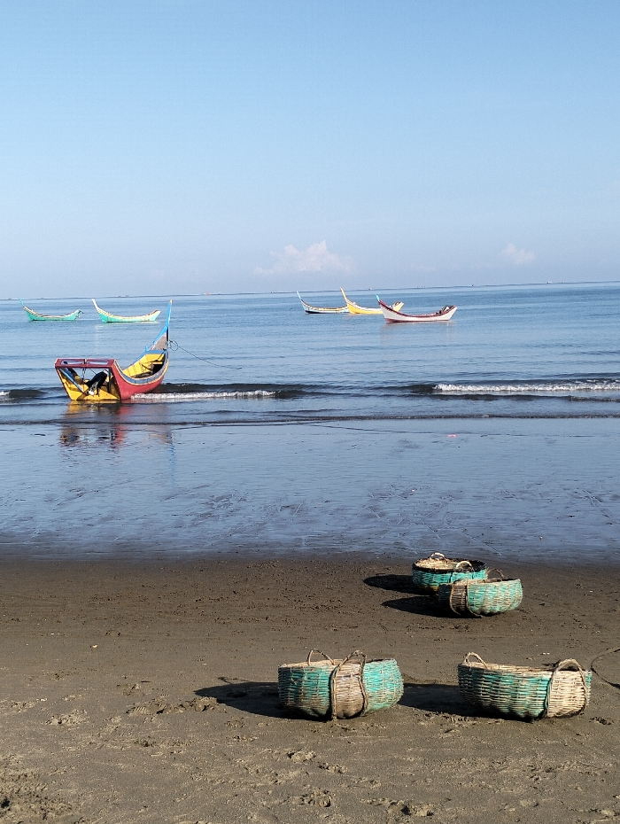 A beach scene under a clear blue sky showcases several brightly colored fishing boats at sea. In the foreground, four woven baskets rest on the dark, wet sand. The boats are various colors like red, yellow, and green, some further out on the calm water. The scene evokes a sense of tranquility and maritime culture.