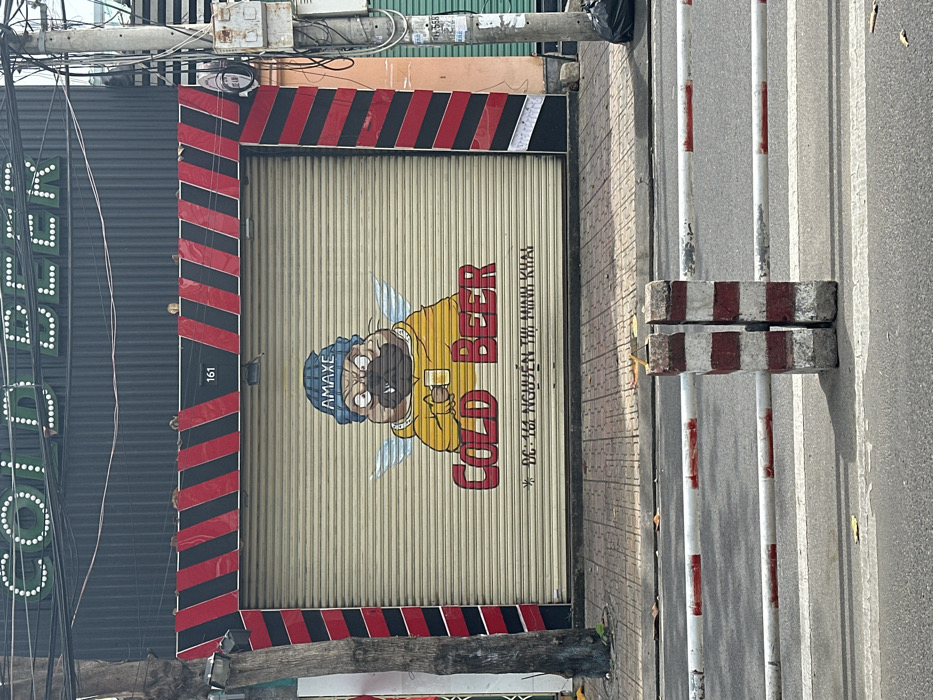 A street view displays a closed business. The metal roll-up door is adorned with a cartoonish character of a pug with wings, dressed in yellow, holding a beer, and labeled "COLD BEER". The door is painted with a beige corrugated pattern and framed with alternating red and black stripes. To the left, a sign reading "COLD BEER" is vertically illuminated. Poles painted white with red stripes and concrete barriers are positioned along the sidewalk near the street.