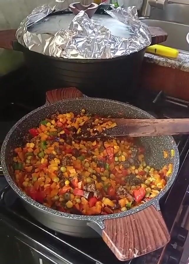 A person stirs a large pan of colorful food on a gas stove with a wooden spoon. The food appears to be a mixture of diced red peppers, carrots, peas, corn, and dark brown chunks, possibly meat. Steam rises from the pan. Behind the pan, there is a large covered pot, wrapped in aluminum foil. A bottle of Morning Fresh dish soap and other kitchen items are visible in the background. The stovetop is black. The person stirring is wearing a patterned shirt.