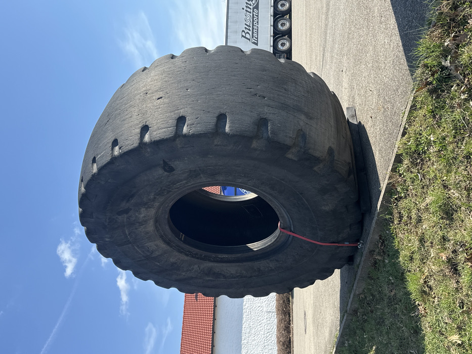 - "A large, heavily worn, dark gray industrial off-the-road (OTR) tire is standing upright on a paved asphalt surface" by FM-UArv82, licensed under CC BY 4.0