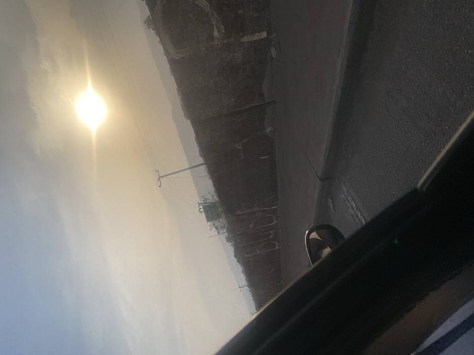 A roadside view from inside a car, angled sideways. The sun shines brightly, partly obscured by haze or smoke, dominating the sky on the left. A road runs alongside a hillside or mountain, dotted with utility poles and a sign. The car's window frame is visible in the foreground, and a side mirror reflects a blurred image of the roadside. The overall scene suggests a drive on a sunny but hazy day near hilly terrain.
