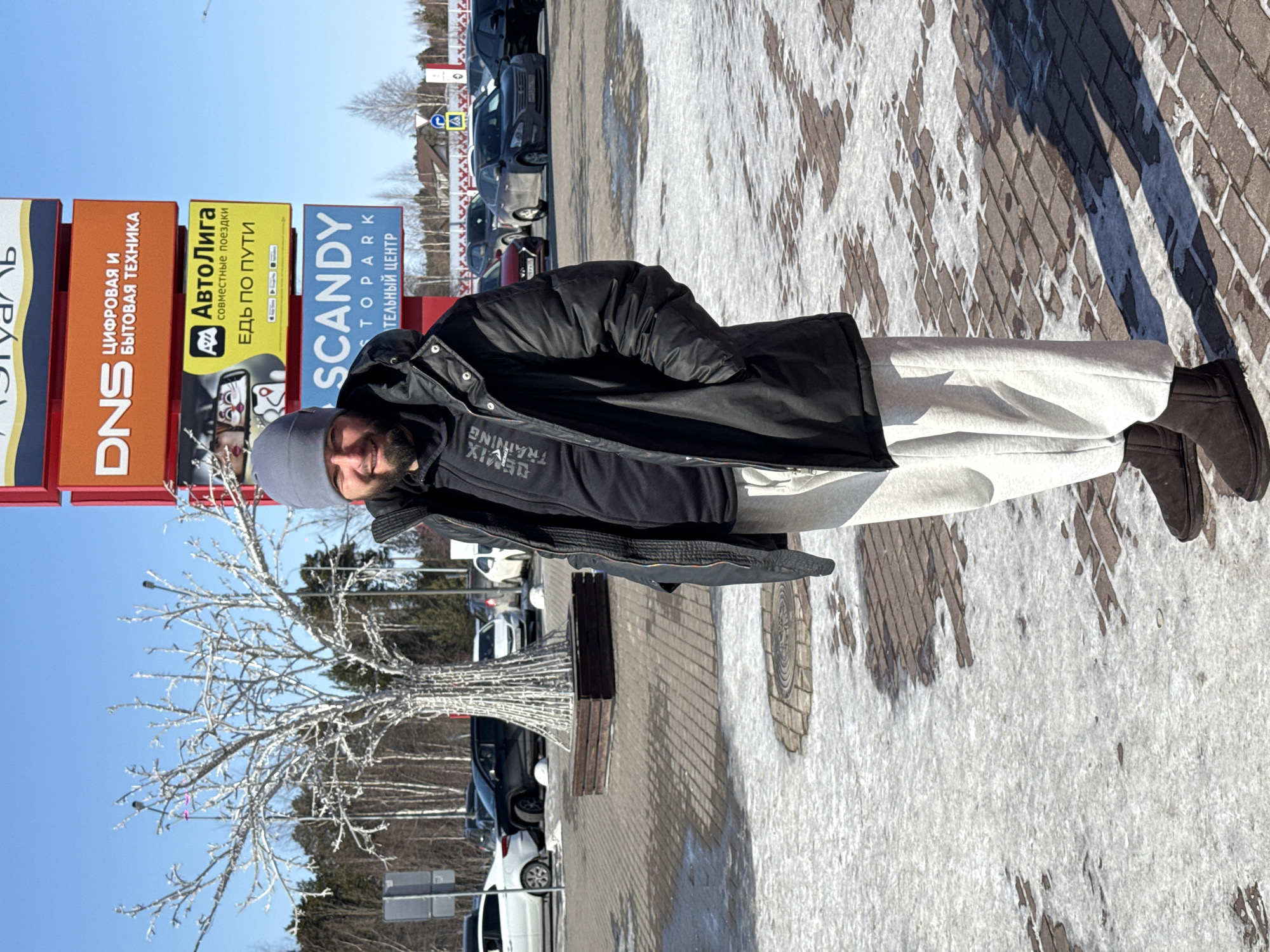 A man wearing a dark coat, light-colored sweatpants, a grey beanie, and brown shoes is standing in front of a sign with the names of various commercial establishments: "DNS - Digital and Household Appliances," "AutoLiga - Joint Trips, Let's go along the way," and "SCANDY-Topark - Retail Center