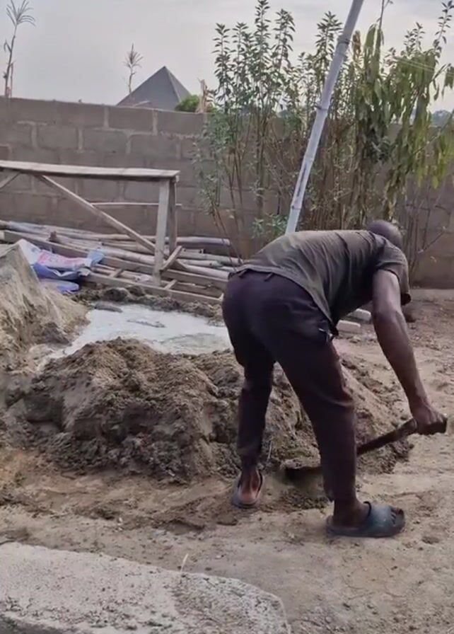 construction site. In the initial frame, a man in a green shirt and dark pants mixes what appears to be cement with a shovel. He is standing on a dirt surface with piles of sand and construction materials nearby. As the camera pans out, two more men are visible, sitting on a partially constructed wall made of concrete blocks. One man wears a pink shirt and a blue baseball cap, while the other wears an orange shirt. They are sitting among piles of gravel and concrete blocks. The environment includes a brick wall in the background, some vegetation, and a view of residential buildings in the distance.