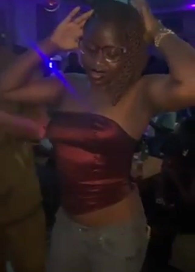 A woman dances in a club. She wears a strapless red satin top and low-rise jeans, along with glasses. Her hair is in small braids. The club is lit with colorful lights and there are other people present, although they are not the focus of the video. She moves her arms and torso while dancing, occasionally singing along to the music.