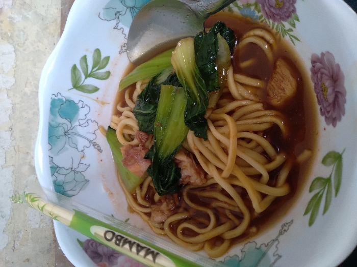 - "A white ceramic bowl with a scalloped edge and teal and purple floral patterns holds a meal consisting of thick yellow noodles, dark green bok choy leaves, and multiple pieces of cooked brownish meat in a dark brown broth" by FM-FI4Yr1, licensed under CC BY 4.0