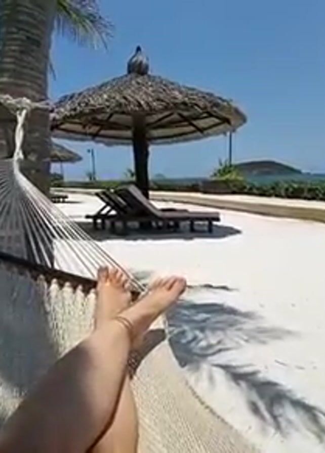 A first-person perspective shot shows a woman's feet and lower legs as she relaxes in a white hammock on what appears to be a beach