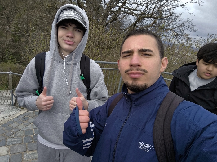 An outdoor selfie-style photograph depicts three males on an elevated path or staircase, consistent with hiking trails on a hill such as the Schlossberg in Freiburg im Breisgau, Germany. In the foreground, a male adult with a mustache and goatee beard wears a dark blue zip-up jacket with a white, partially reversed logo reading "ULTRA," and a black backpack. He holds the camera in an extended right arm, displaying a thumbs-up gesture with his right hand, and looks directly at the camera with a neutral expression. To the left, a young male, possibly a teenager, wears a grey hooded sweatshirt with the hood up, a grey cap beneath, and grey sweatpants. White wired earphones hang around his neck. He has a black backpack and gives a double thumbs-up gesture, looking towards the camera with a slight smile. Partially visible in the background to the right is a third young male wearing a black jacket over a grey shirt. His head is tilted downwards, and he is not directly engaging with the camera. The environment includes a grey metal railing separating the subjects from the background. Cobblestone paving is visible on the ground in the lower-left quadrant. The background features deciduous trees with minimal foliage, indicating early spring, under an overcast sky.