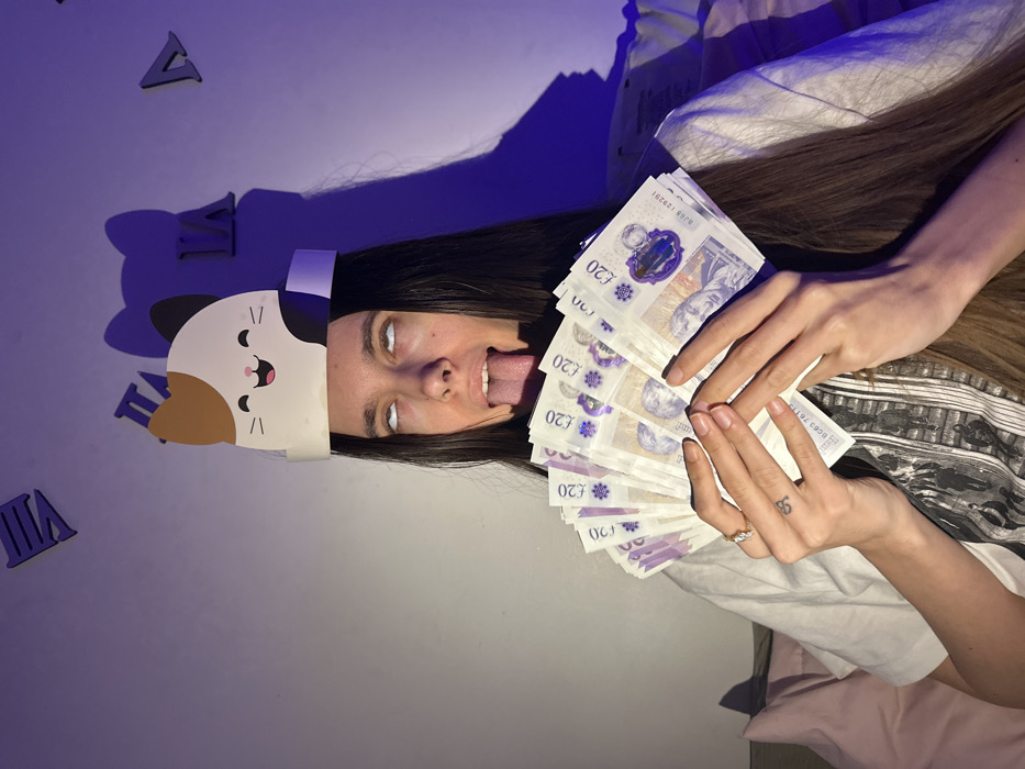 A female individual is depicted in a residential setting in Corby, United Kingdom. She has long, dark hair and is wearing a white t-shirt featuring a monochrome graphic design. A white, orange, and black cat-themed paper party hat is positioned on her head. Her eyes are rolled upwards, exposing the whites, and her tongue is extended. She holds a fan of approximately ten to twelve purple polymer twenty-pound sterling banknotes in both hands, prominently displayed. A gold-colored ring with a white stone is on the ring finger of her left hand, and a small, stylized 'S' tattoo is visible on the web between her left thumb and index finger. The background consists of a plain, light-colored wall adorned with dark Roman numeral clock elements (VII, IX, X, XI). The scene is illuminated by a strong purple-blue light source from the left, casting distinct shadows to the right of the subject and the party hat. A pink fabric item is partially visible in the lower-left foreground.