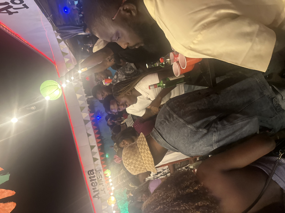 The photo shows a nighttime gathering of people. There's a group around a table with red cups and liquor bottles. A man in a light-colored shirt stands closest to the camera. Several other people are visible, including a woman in a white shirt and others wearing patterned clothing and hats. Lights and decorations adorn the venue, including a structure with "Arena" written on it. The lighting appears low-key, creating a relaxed atmosphere.