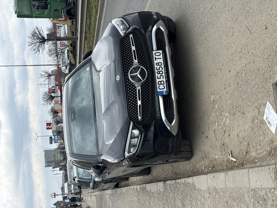 The image displays a black Mercedes-Benz GLC SUV, license plate CB 5858 TO (Sofia, Bulgaria), parked partially on an unpaved dirt and gravel shoulder next to a concrete curb